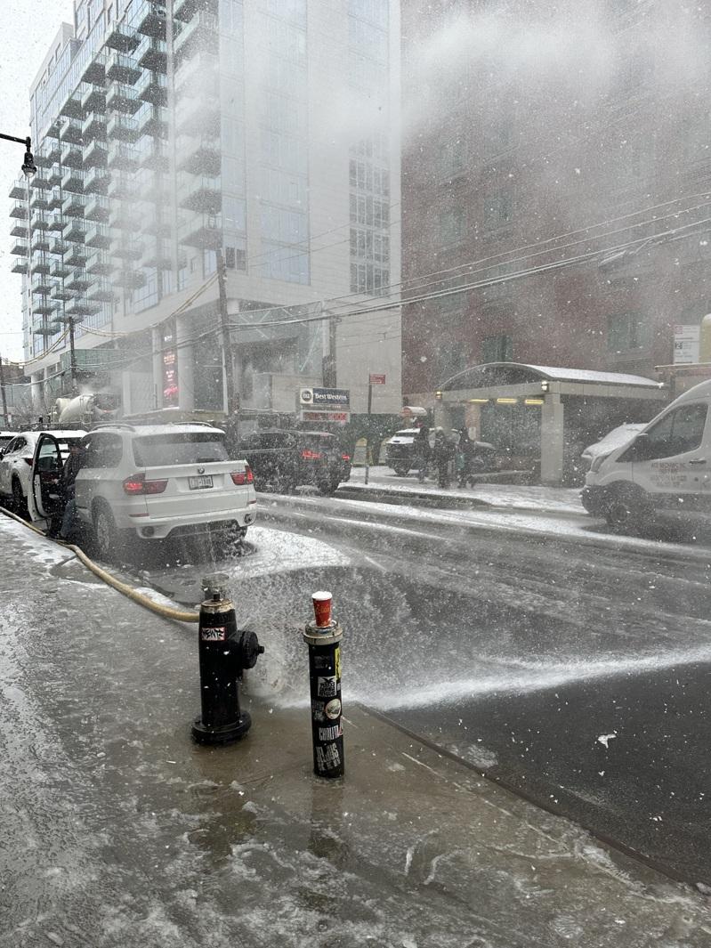 事发于今日午间降雪最猛烈时段,现场一辆工程车在施工期间,疑似操作不慎,连接消防栓取水的黄色管线突然脱落,高压水柱瞬间喷射而出,直冲空中后如瀑布般倾泻在人行道与车道上,场面惊人。