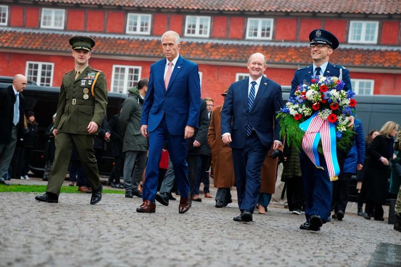 温和派共和党北卡州联邦参议员提里斯(前中)与两党其他参众议员17日访问丹麦,沟通有关格陵兰争议。(路透)