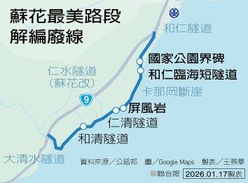 行政院日前公告台九丁64.262公里到69.119公里路段解编废线。长期研究公路的交通脸书社团「公路邦」说,和仁到大清水的临海道,自1932年通车,路长近5公里,紧贴卡那冈断崖及太平洋。废线后,沿线将有3大景点成为绝响,包括可眺望和仁海湾的热门打卡点太鲁阁国家公园界碑;长约30公尺,手工开凿没有衬砌,且是苏花路廊唯11座日据时代使用至今的和仁临海短隧道;以及卡那冈断崖路段的知名景点屏风岩。