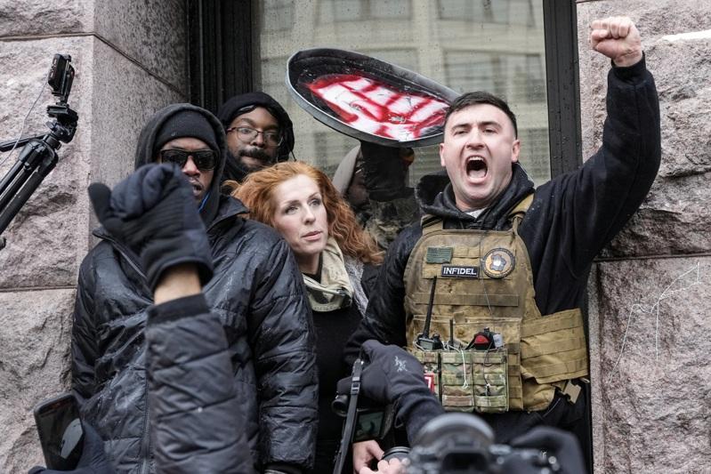反非法移民诈骗社福经费的保守派网红朗恩(右)17日在明市市政厅外发起抗议活动,与自由派人士不满,双方爆发口角。(路透)