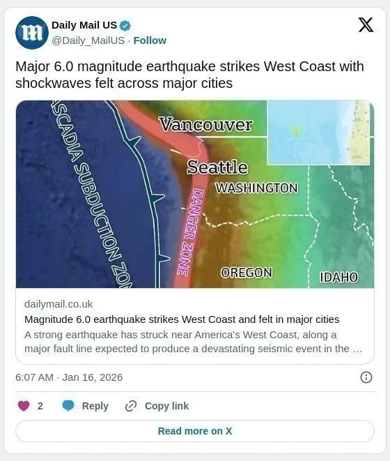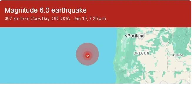 美国西海岸时间周四(1月15号)晚间,俄勒冈州近海发生6.0级地震,震中位于太平洋,距海岸约180英里(约290公里)。此次地震的震感波及多座城市,专家预计未来几天仍可能出现余震。