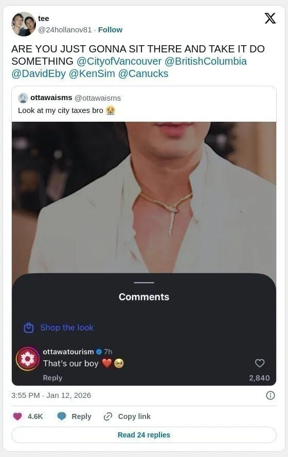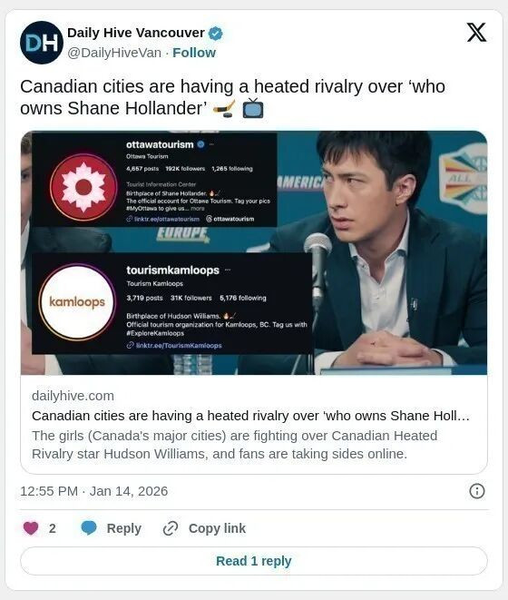 面对这场“炽热城市对决”,温哥华市政府也亲自下场回应,语气相当官方又带点凡尔赛:“我们注意到渥太华和蒙特利尔正在争论谁拥有 Shane Hollander。但需要提醒大家,现实中的哈德森·威廉姆斯是一位温哥华人,我们对此非常自豪。至于虚构角色的归属,就交给他们去争吧”。