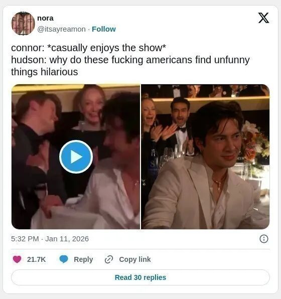 随着威廉姆斯人气飙升,他不仅成了“互联网男友”,还频频登上深夜脱口秀、红毯不断,甚至亮相了 2026 年金球奖。
