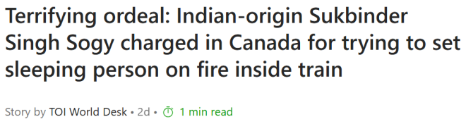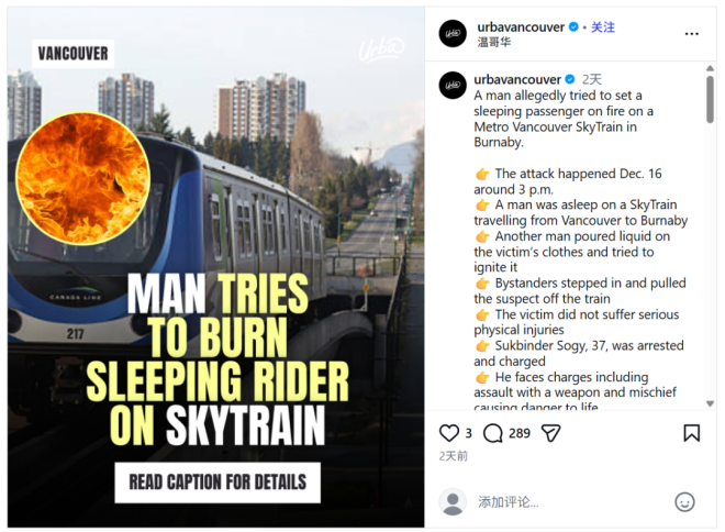 据报道,一名居住在素里市的37岁印度裔男子Sukbinder Sogy,因涉嫌在一列行驶中的天车(SkyTrain)上试图纵火烧伤一名正在熟睡的乘客,已被加拿大警方正式起诉。