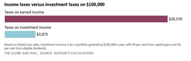 假设一名员工的年薪为 100,000 加元,而一名投资者的投资组合每年产生 100,000 加元的资本利得和股息。