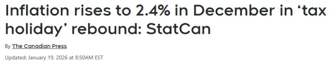 加拿大统计局表示,由于联邦政府的临时减税措施在一年前结束,12月的年通胀率被推高了两个基点,升至2.4%。