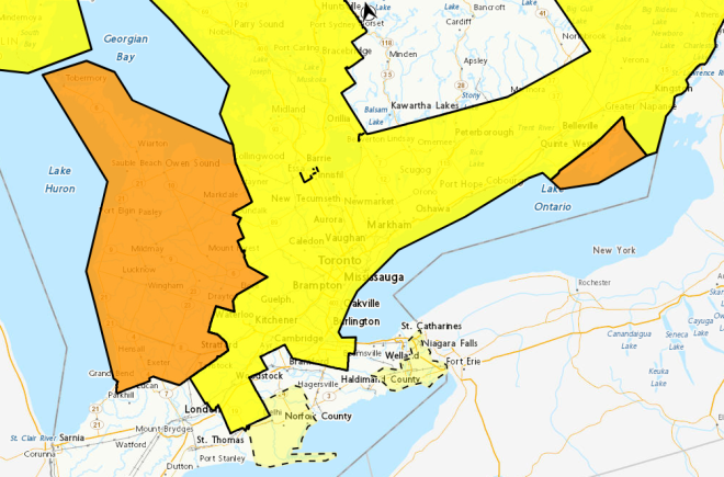 中午12点多,环境部的天气警报地图显示,整个安省南部,包括大多伦多地区,均受到这场恶劣暴风雪的影响,各个地区的程度不尽相同。