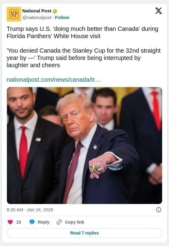 特朗普在受到热烈掌声后继续说道:“我们和加拿大有点小竞争。虽然他们是伟大的人,但没关系,我们做得比加拿大更好,对吧?我们希望他们也能做得好,他们会做得好的”。特朗普的这番话再次让美国与加拿大的冰球竞争成为焦点。黑豹队在上赛季的斯坦利杯决赛中击败了埃德蒙顿油人队,这意味着加拿大再延续冠军荒。自1992-93赛季蒙特利尔加拿大人队夺冠以来,所有加拿大队伍都未能再夺得斯坦利杯。